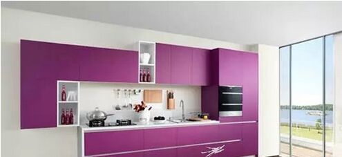白色墙面与紫色橱柜的映衬,橱柜的板面是白色线条勾勒出的紫韵,整个空间有着大面积的紫白搭配,而嵌入墙壁的柜身,非常省空间,也极具时尚,使厨房增加现代感元素。